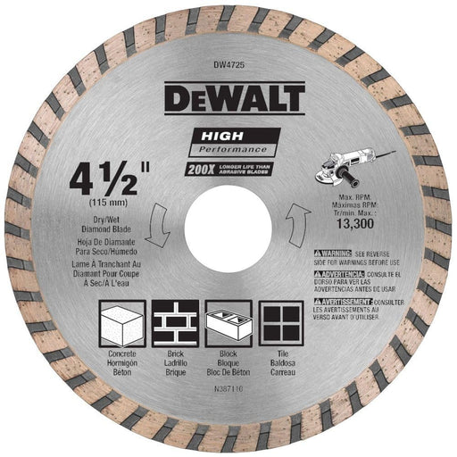 View full detailsDEWALT DW4725 Diamond Blade for Masonry, Dry Cutting, Continuous Rim, 7/8-Inch Arbor, 4-1/2-Inch