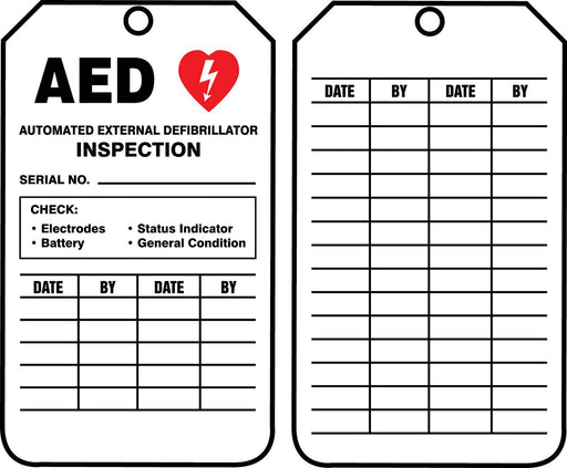 View full detailsAccuform TRS345PTP Inspection Record Tag, "AED AUTOMATED External DEFIBRILLATOR Inspection", 5.75" Length x 3.25" Width x 0.015" Thickness, RP-Plastic (Pack of 25)