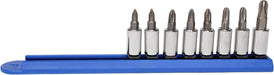 The Mayhew Tools 16012 8-Piece Philips socket bit set includes P1 (2x), P2 (3x), P3 (2x) and P4 (1x). Socket bits can be used with the appropriate ratchet, T-handle, or socket spinner handle. Bits made from S2 tool steel with proprietary heat treatment for superior strength and durability. Precision tip profile manufactured for positive and precise fastener engagement. Sockets made from alloy steel with proprietary heat treat for long life and lasting performance. Fully polished, chrome plated sockets for superior corrosion resistance. Design of socket and bit assembly allows for easy replacement of broken or worn bit. Tip sized appropriately to 1/4-Inch, 3/8-Inch, and 1/2-Inch square drives for maximum torque and minimum damage to tips or fasteners. Bits and sockets made to exacting specifications. Includes color coded storage rail.