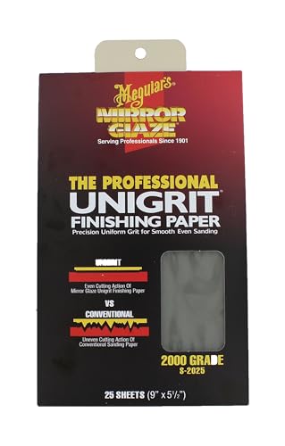 View full detailsMeguiar's Unigrit Finishing Paper - 2,000 Grit - Pro Wet/Dry Sandpaper, Fast and Even Cutting Action with Smooth Sanding Pattern That Eliminates The Risk of Deep, Uneven Sanding Scratches, 25 Sheets