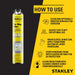 STANLEY PRO GAP FILLER is a user-friendly, self-expanding aerosol polyurethane foam specifically designed for convenient application. It is a single-component foam that cures naturally. FIELDS OF APPLICATION: 1. Fixing and insulating door and window frames, 2. Filling and sealing gaps, joints, and cavities, 3. Filling penetrations in walls, 4. And even insulating electrical outlets and water pipes. SURFACE PREPARATION AND FOAM APPLICATION: 1. SURFACE: Clean the substrates to remove dirt, dust, grease, rust, or any contaminants. Make sure the surface is dry. If the temperature is above 32°F, you can lightly sprinkle water using a gardening sprinkler. 2. PRODUCT: The optimal can temperature is 68°F. 3. APPLICATION: Shake the foam can vigorously before use to ensure proper mixing. Attach the can to the dispensing gun. Always hold the can upside down and activate the foam by pressing the valve. Enhance adhesion and shorten curing time by moistening the surfaces and the foam. Start filling vertical gaps with foam from the bottom, moving upwards. Avoid completely filling the gap, as the foam will expand over time. 4. TOOLING AND FINISHING: To shield foam from UV damage, coat it with plaster or paint once it's fully set. To avoid foam drying in the applicator, use the entire can without pausing for over 5 minutes between sprays. 5. CLEANING: Use Foam Cleaner to clean fresh foam and Gun. For cured foam, mechanical cleaning is required, as it cannot be cleaned with chemicals. EFFECTIVE USAGE: The curing process depends on temperature and humidity. Rushed surface prep can harm the foam's structure. Don't use the foam in stuffy or sunny areas, apply it valve-down for efficiency, for outdoor use, consider painting it, and cold weather can make it cure slower and produce less foam.