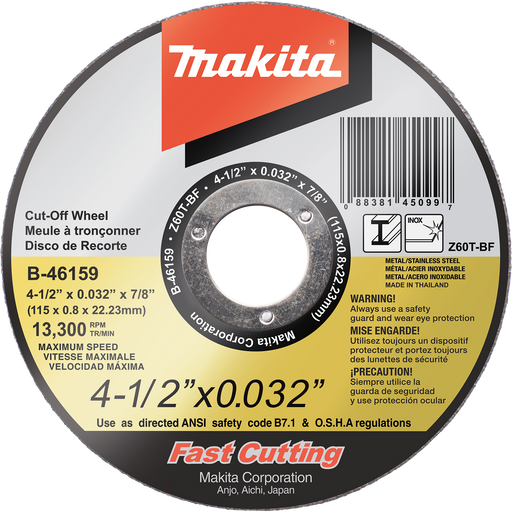 View full detailsMakita 4‑1/2" x .032" x 7/8" Ultra-Thin Cut‑Off Wheel, Stainless