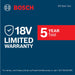 • FIVE-YEAR LIMITED WARRANTY: Bosch 18V cordless power tools are covered by a five-year limited warranty. For details, visit the Bosch Tools website or call 1-877-BOSCH99.