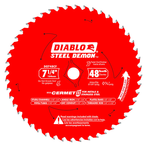 Ver todos los detallesDiablo D0748CFA Steel Demon Cermet II Saw Blade with Triple Chip Grind and Perma-Shield Coating, Ideal for Medium Metal Cutting, 7-1/4" Diameter, 48 TCG Teeth