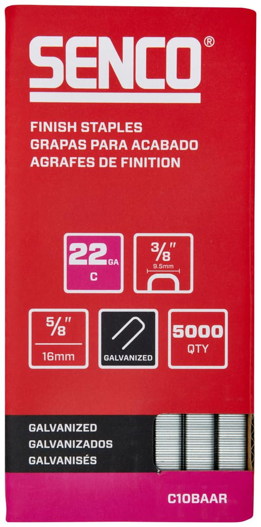 SencoThe SENCO C10BAAR Finish Staples are 5/8" long 22 Gauge 3/8" Crown fasteners with a Galvanized Finish. These fasteners come in a 5,000 Count Pack. ...