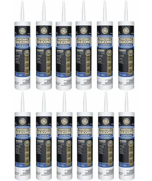 GE Supreme Paintable Silicone Caulk for Window & Door, White, 9.5 fl oz Cartridge, 100% Waterproof Silicone Sealant, 7X Stronger Adhesion, Freeze & Sun Proof (Pack of 12)