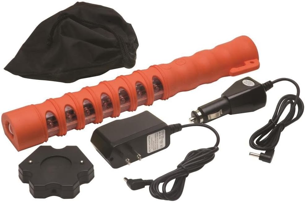 LED Baton Road Flare Rechargeable. Includes a 120V wall Charger, 12V Car Charger and USB Charger. Features 15 LEDs visible up to 1/2 mile, is waterproof to 50 feet, has 5 flash patterns including SOS Morse Code and is crush and corrosion proof. High strength magnets to allow attachment to any ferrous metal surface. Run time is 5 to 10 hours depending on flash pattern.