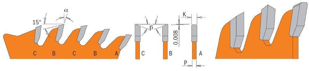 • 0.126 kerf + 0.087 plate thickness, 12° hook angle, 4 alternate teeth, 1 trapezoidal tooth Grind