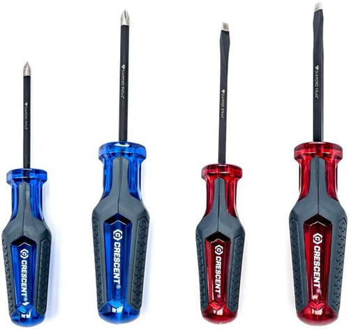 The Crescent 4 Piece Screwdriver Set features diamond coated tips that help to maximize gripping power while driving and removing fasteners. These drivers also feature co-molded acetate handles for comfort and durability while fastening. The drivers are color coordinated by handle for quick identification on the job.