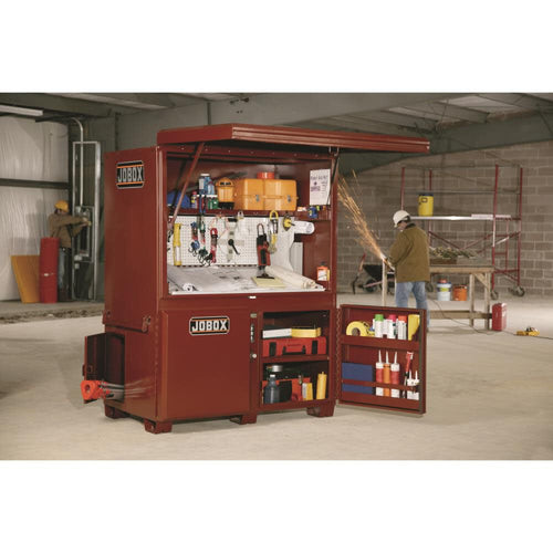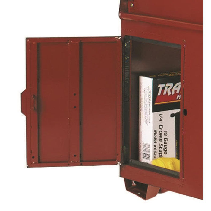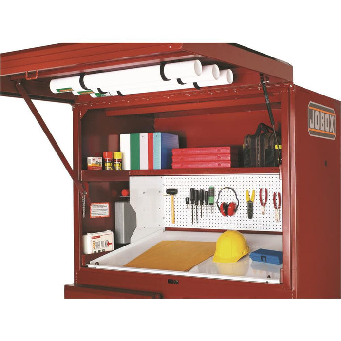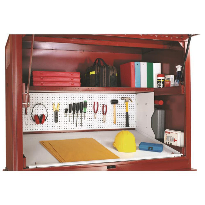 Your office away from the office, only much more organized, with loads of storage and world class durability. The office center provides an extra-large, lockable desktop with high visibility white interior and hanging pegs. Plenty of storage space including an easy access rear storage locker for longer tools and equipment.