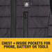 • AMPLE AND CONVENIENT STORAGE: Battery storage pockets located on the lower back as well as a vertical zipper pocket on the inner left chest, Phone/battery pocket with hook and loop closure on the lower inside and there are also convenient pockets such as a waterproof zipper phone pocket on the left chest and vertical waterproof zippered