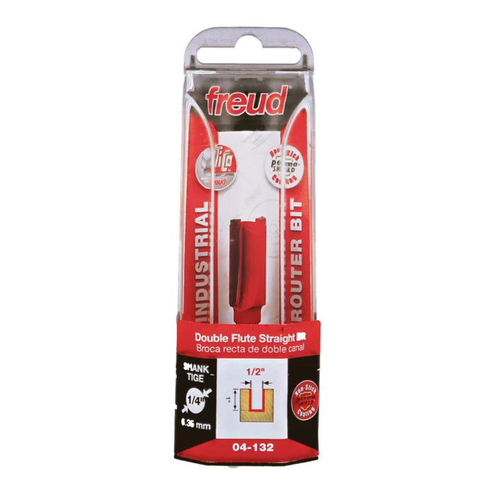 1/2" (dia.) Double Flute Straight Bit with 1/4" shank, 2-1/8" overall length These bits cut smoother than other straight bits because of the precise shear and hook angles. End of bit relief allows for fast plunging. Covered by Freud's limited lifetime warranty.