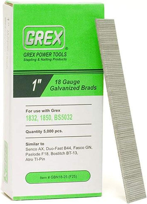 Precision drawn wire guarantees consistant accurate hits. Optimized tensile strength for each length. Durable yet flexible collation minimizes strip fragmentation. Minimizes nail jams and prevent damage to your tool. Easily penetrates through red oak up to 2". Sixteen years of proven results with our pins and nails. GREX GBN18-25 18 Gauge 1" Length Galvanized Brad Nails are for use in GREX Model # 1832, 1850 & BS5032. Brads are similar to: DUO-FAST B44, PASLODE F18, FASCO GN, SENCO AX, BOSTITCH BT13, BeA SK300. (5,000 per box)