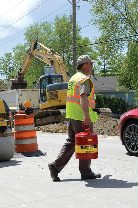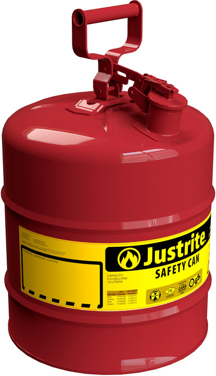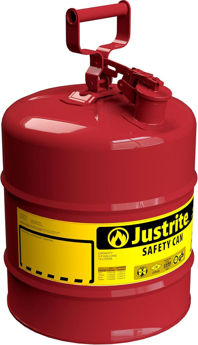 Justrite 5 Gallon Type I Red Safety Gas Can for Gasoline with Flame Arrester and Self-Closing Lid, Made in the USA, Galvanized Steel Flammable Storage Can, 7150100