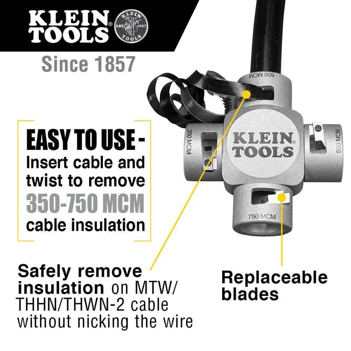 A quick and effective tool to cleanly remove the insulation on MTW/THHN/THWN-2 cable without nicking the wire. Clover design features four different sizes (350, 500, 600 and 750 MCM) in one tool. Simply insert the cable and twist for precise, clean cuts. The robust design ensures long tool life. Stripping cables has never been easier and safer. For more than 160 years, Klein Tools has manufactured premium-quality, professional-grade hand tools that deliver the performance, durability and precision needed to get the job done right. Our family of engineers, workers and craftsman continue to put six generations of expertise into every tool we create by using only the highest quality materials, superior workmanship, and keeping manufacturing as close to home as we can. Klein isn't just the name of our company, it's also our family name. And since we're an American company that's family-owned and family-run, you know you can count on us to be here tomorrow. Klein Tools doesn't just make great products, we make great products that stand up to the demands of the professionals who use them every day ... Since 1857.