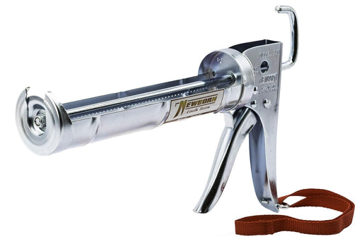 The Newborn 610-AL aluminum smooth rod caulking gun fits 10 oz. sausage packs, 10 oz. bulk caulk, or 8-1/2" or 10" cartridges, and has an 18:1 thrust ratio for use with high viscosity materials such as acrylic, adhesives, asphalt, butyl, and cement. The smooth pressure rod requires less force and is quieter than a ratchet-style pressure rod. The aluminum barrel and zinc alloy handle and trigger are lightweight and provide corrosion resistance. The caulking gun includes a cup for use with sausage packs, a combination dual hytrel cup and conical ejector for use with bulk caulk, and three plastic cone nozzles.
