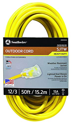 Southwire 2588SW0002 Outdoor Cord-12/3 SJTW Heavy Duty 3 Prong Extension Cord-for Commercial Use (50'; Yellow); 50 Feet
